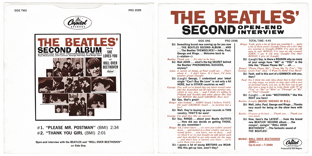 | Capitol | PRO-2598/9 | Second Album Open-End Interview (Promotional issue only, issued to promote The Beatles Second Album. Contains an open-end interview with the group and 3 LP tracks.) | 4/64 | $1,200.00 | |