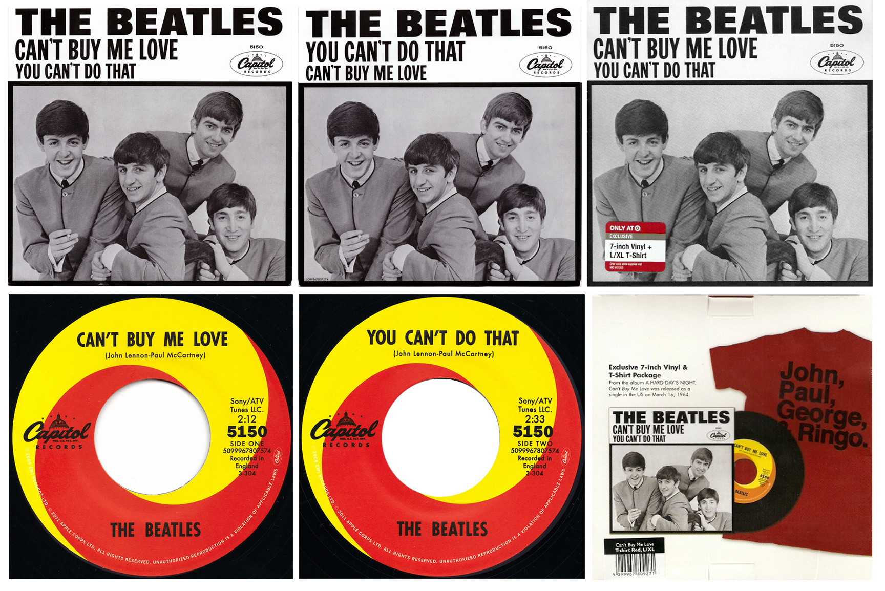 | Capitol | 5150 | Can't Buy Me Love (2011 reissue. Exclusive 7-inch vinyl and t-shirt package sold at Target. The number "5099967807574" is printed on the lower left corner of the sleeve on the B-side) | You Can't Do That | 2011 | $15.00 | |||||||||