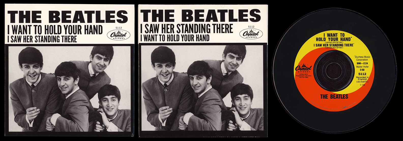 | Capitol | 5112 | I Want To Hold Your Hand (East Coast copies show all of Geroge's head, the West Coast copies crop off part of Gerrge's head. Originals do not have periods placed at the end of the small print "REG. U.S. PAT. OFF.") | I Saw Her Standing There | 01-13-64 |