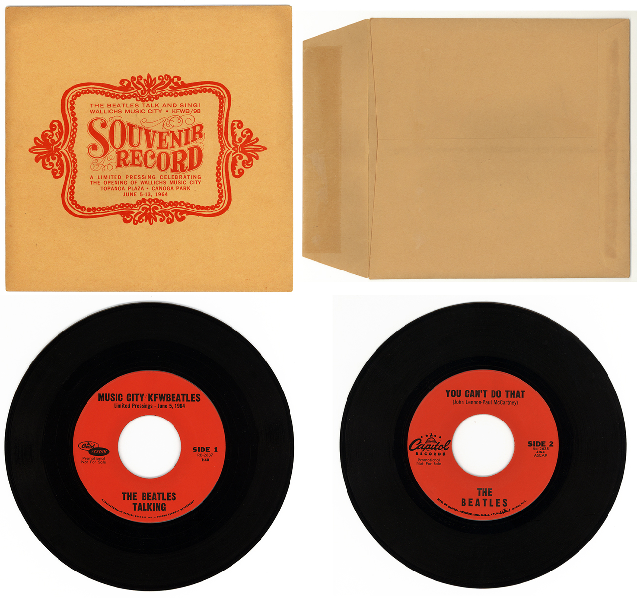 You Can't Do That (Title sleeve/mailer, incredibly rare Capitol Records promotional 45, issued in a 7-1/4" square manila envelope with red print. This record was pressed to celebrate the grand opening of "Wallich's Music City" record store in Canoga Park, CA. in the Summer of 1964. The stores owner, Glen Wallich, was also the co-founder of Capitol Records This record was only available through radio station KFWB (a major radio station that played rock 'n' roll from the late 1950s until the mid-1960s) and Wallich's store chain. They were only pressed on the west coast in very limited numbers, making it one of the rarest of all Beatles singles. Less than a dozen original copies are known to still be sealed. Even opened copies can command a very high premium - an auction sale of a near mint to mint sleeve and disc in January of 2022 ended with a winning bid of $6,589).