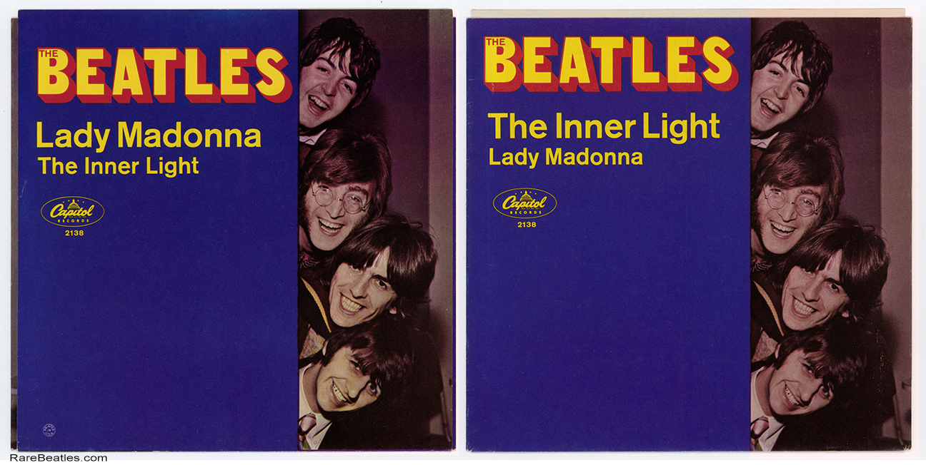 | Capitol | 2138 | Lady Madonna (Another sleeve that is almost impossible to find without ring wear or disc impression. Original pressings included a fan club flyer which is valued at $60.00 in NM condition. The Beatles' faces on the West Coast Lady Madonna sleeve have a greenish tint, as opposed to the reddish tint found on the East Coast copies. Also on the West Coast issue, the left and right sides of the folded paper, visible on The Inner Light side, are bowed outward at the bottom (as opposed to the straight sides on the East Coast sleeve). The East Coast version of the sleeve has its larger side as the Lady Madonna side while the West Coast version of the sleeve has its larger side as the Inner Light side) | The Inner Light | 03-18-68 |
