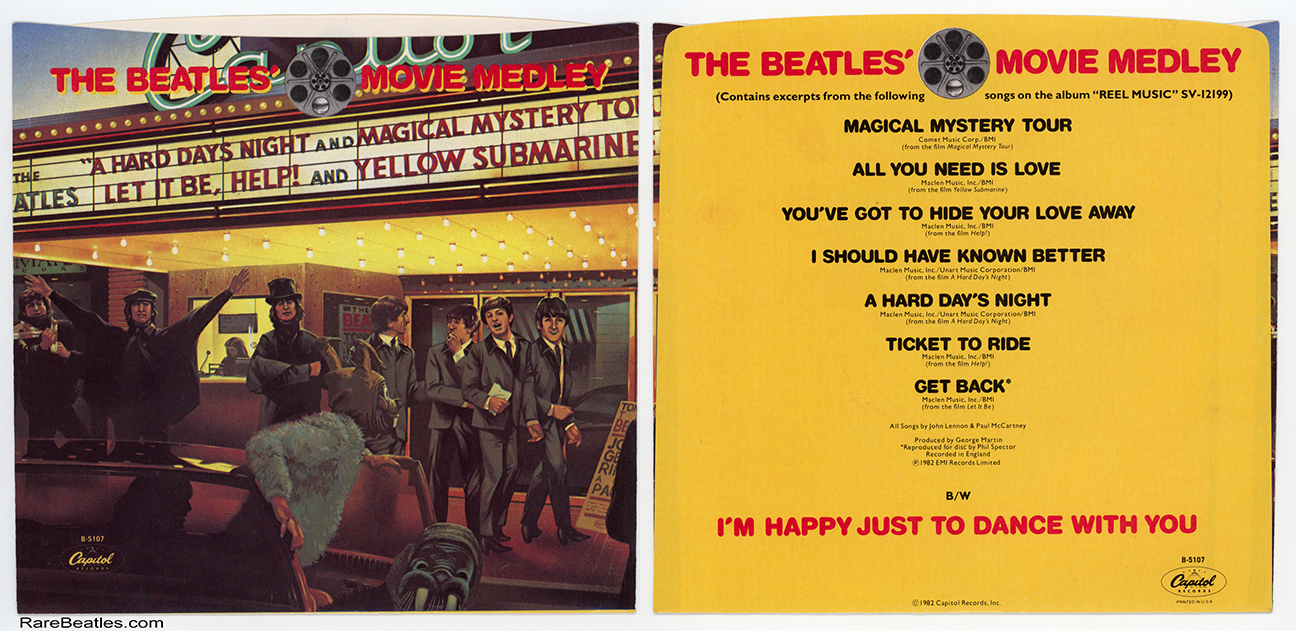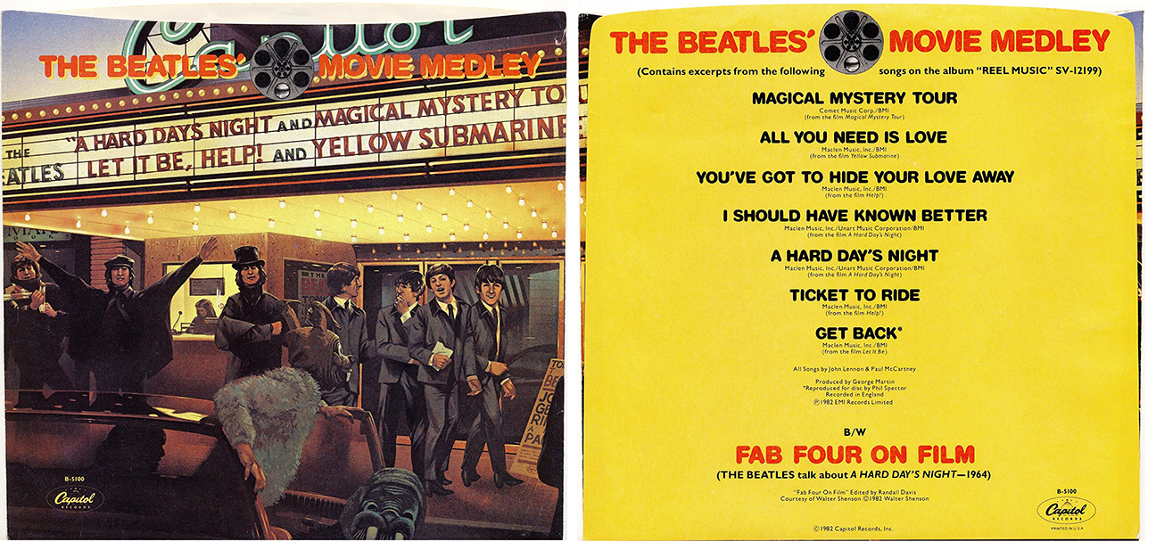 | Capitol | B-5100 | Movie Medley (withdrawn just prior to release, supposedly due to royalties issues, replaced with new B-side, see next entry below) | Fab Four On Film | 02/82 | $20.00 | |||||||||