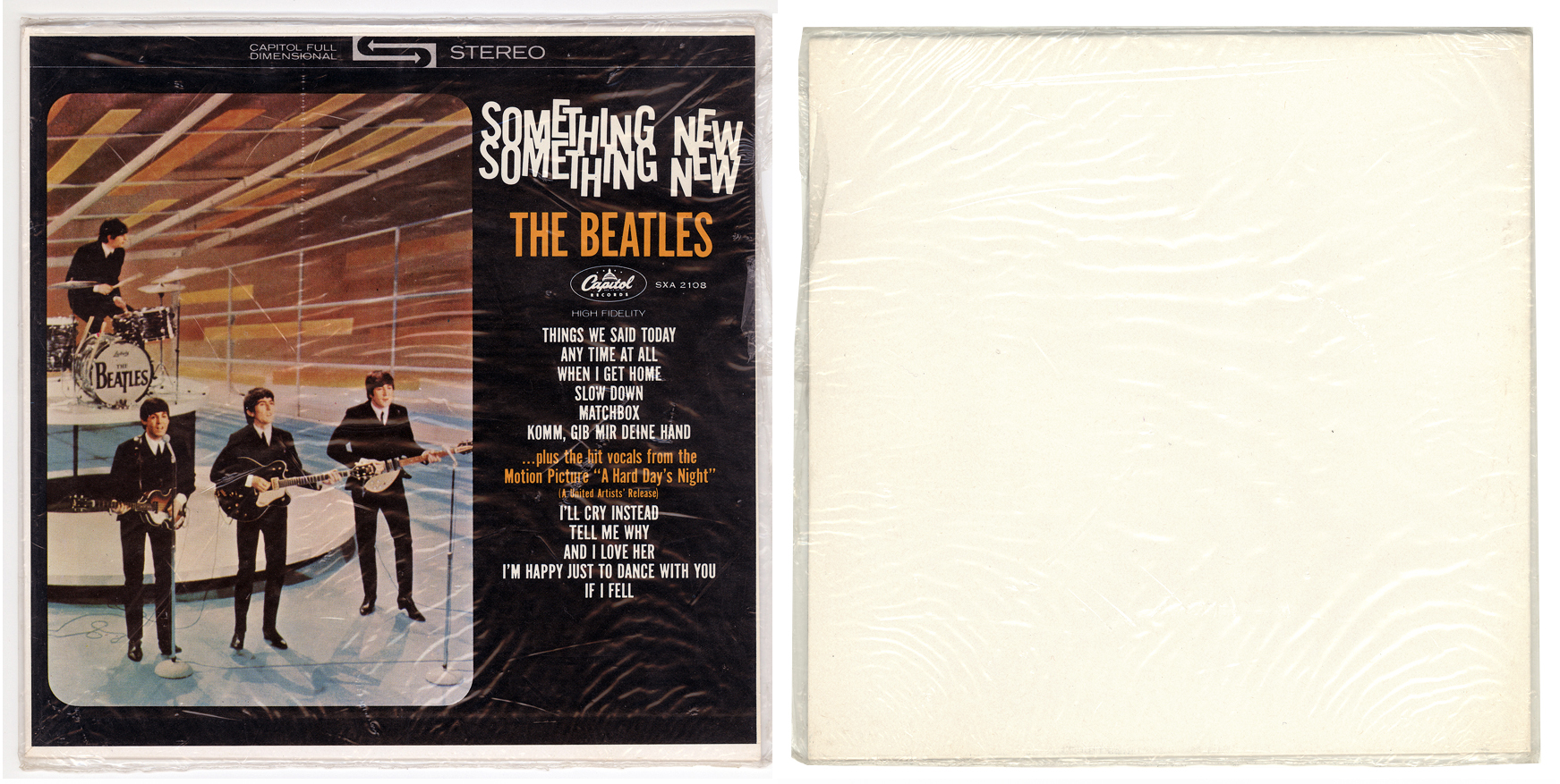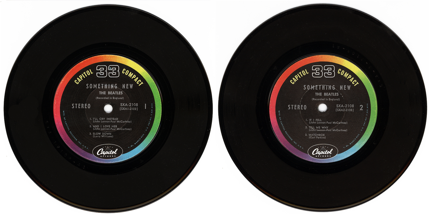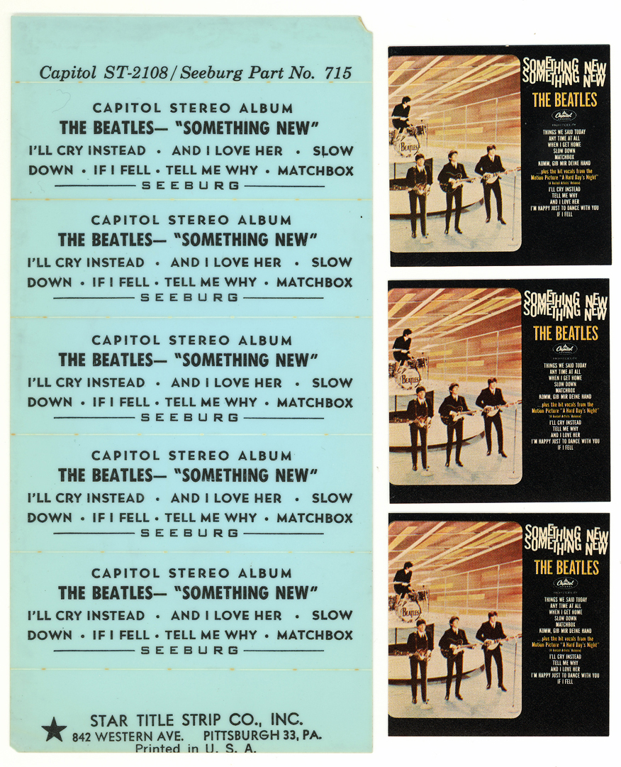 | Capitol | SXA-2108 | Something New Compact 33 (Issued for use in jukeboxes, contains 6 tracks from the LP, hardcover jacket with blank back. Originally issued with five connected Seeburg 3" x 1" Jukebox blue title plastic strips and three 1-7/8" x 1-7/8" mini lp cover paper inserts, both manufactured by the Star Title Strip Co.) | 1964 | $1,200.00 | |