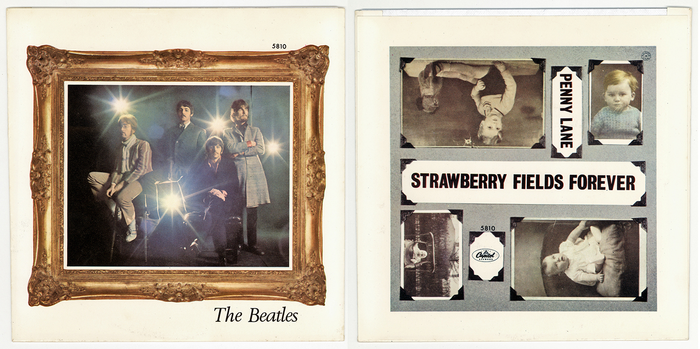 | Capitol | 5810 | Penny Lane (Known counterfeits have inferior quality photo and print, straight cut top, and perforated outer edges) | Strawberry Fields Forever | 02-13-67 |