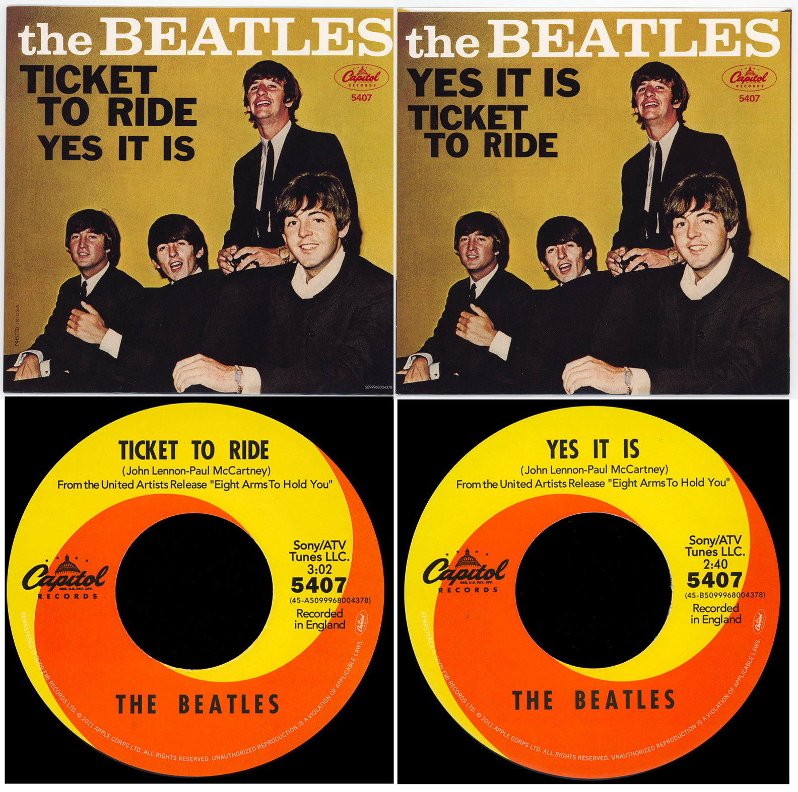 | Capitol | 5407 | Ticket To Ride (special edition, part of a 4-disc 45 rpm box set issued for Record Store Day in 2011. The number "5099968004378" is printed in the lower right corner of the A-side of the sleeve) | Yes It Is | 4-16-11 | $15.00 | |||||||||
