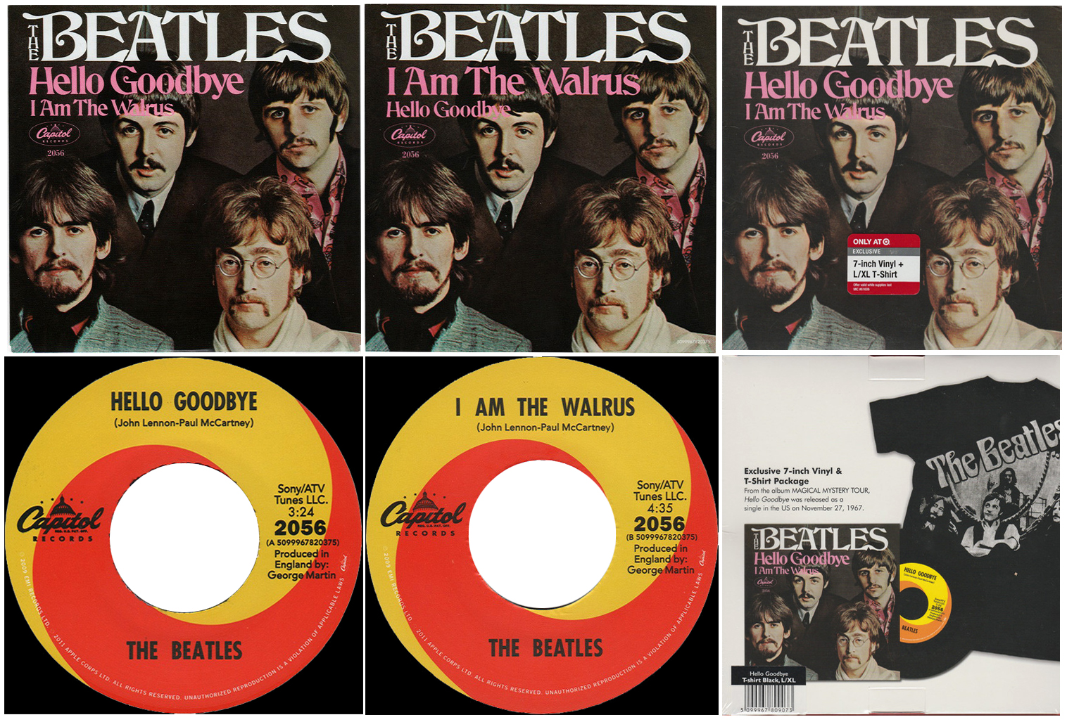 | Capitol | 2056 | Hello Goodbye (2011 reissue. Exclusive 7-inch vinyl and t-shirt package sold at Target. The number "5099967820375" is printed on the lower right corner of the sleeve on the A-side) | I Am The Walrus | 2011 | $15.00 | |||||||||