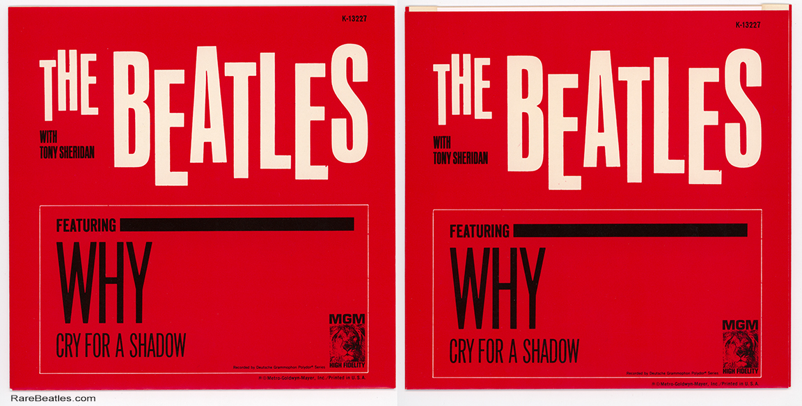 | MGM | K-13227 | Why (This is the second of two Beatles picture sleeves issued by MGM, and by far the scarest of the two. True near mint to mint copies rarely turn up for sale. One of the known counterfeits is only 7" wide - which does not allow a disc to fit in!) | Cry For A Shadow | 03-27-64 | $400.00 | |||||||||