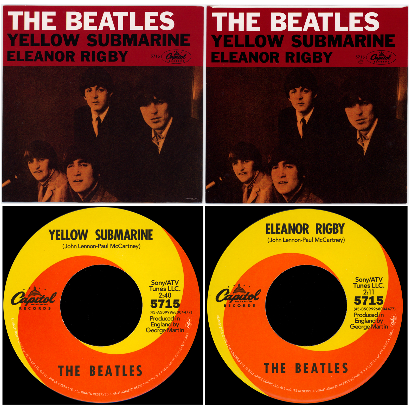 | Capitol | 5715 | Yellow Submarine (Due to its dark cover, this is one of the hardest sleeves to find without disc ring-wear. Known counterfeits have only the die-cut top, and the photo and print quality is inferior) | Eleanor Rigby | 09-08-66 |