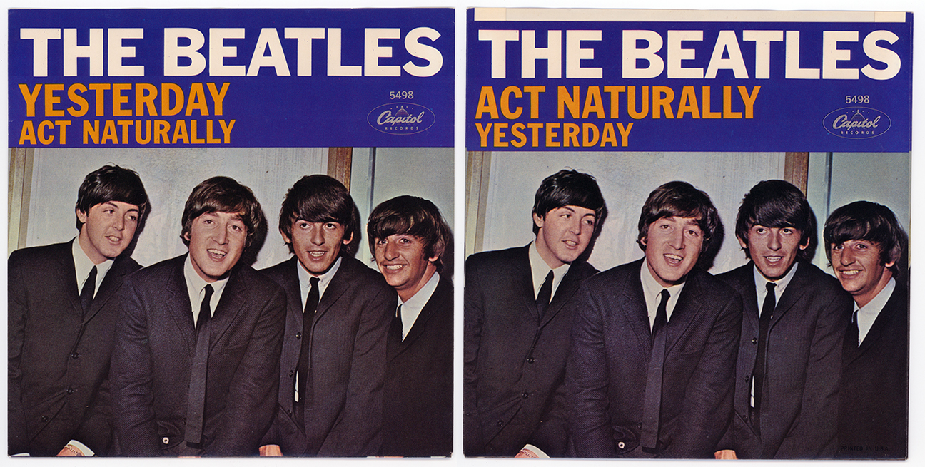 | Capitol | 5498 | Yesterday (Known counterfeits have inferior quality photos and print, and are straight cut along the top) | Act Naturally | 09-13-65 |