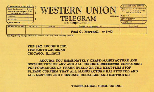 "...REQUIRE YOU IMMEDIATELY CEASE MANUFACTURE AND DISTRIBUTION OF ANY AND ALL RECORDS CONTAINING PERFORMANCES OF FRANK IFIELD OR THE BEATLES...PLEASE CONFIRM THAT ALL MANUFACTURING HAS STOPPED AND ALL MASTERS AND PRESSINGS RECALLED AND DESTROYED..."