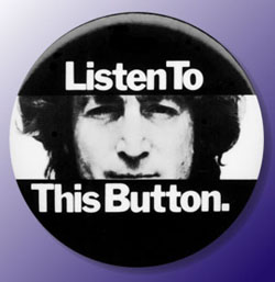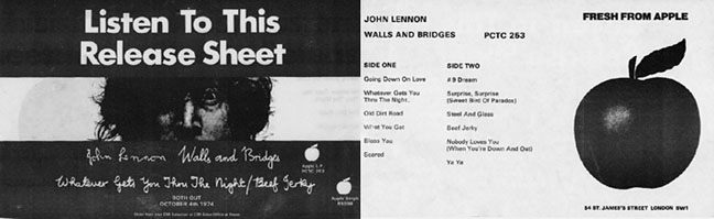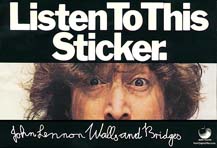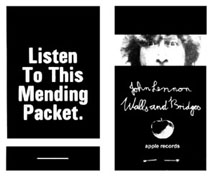 | For the release in September 1974 of John Lennon’s Walls and Bridges album, Capitol Records implemented one of its most aggressive ad campaigns ever. Under the theme of "Listen To This______", Capitol designed and printed the following different promotional items and ads. Most were in black and white, and featured several different close-up photos of John. Shortly thereafter an east coast Beatle dealer designed and manufactured several "Listen To This_____" counterfeit/pirate items that first appeared at Beatlefests in 1975. Those items are at the end of this list. |