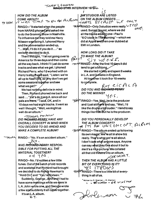 | 17. | LISTEN TO THIS INTERVIEW | Print interview, A 1973 Ringo Starr interview "modified" by John Lennon. Issued separately and also included with the Press Kit (item 12). Here is the front of the card. |