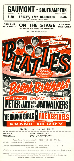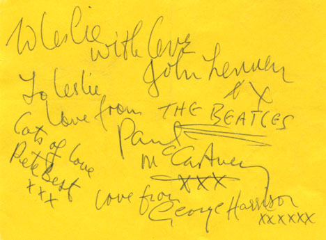 | Jan. 25, 1998 | Here's a rare 1962 autograph signed by John, Paul, George, and Pete Best, and a 1963 UK handbill for the "The Dynamic!, Exciting!, Fabulous Beatles!" for their December 13, 1963 live appearance at the Gaumont Theatre. | |