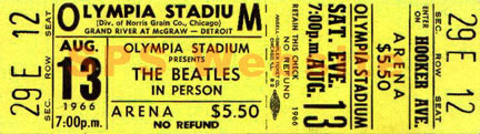 | Dec 16, 1998 | Added a scan of a full ticket for the August 13, 1966 concert at Olympia Stadium, Detroit to our Beatles Concert Tickets page. Also added a scan of the ticket order form for the 1965 Cow Palace show. | |