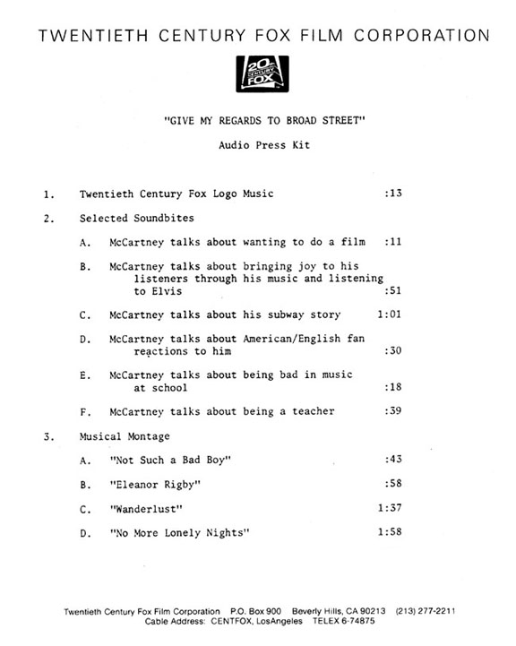 | Aug 04, 1998 | Added several new scans in our Reel-to-Reel Tapes section, including a rare 'manufactured under license' version of A Hard Day's Night, The Family Way soundtrack, and the rarest of all Beatles/solo reel tapes, the Audio Press Kit for Paul's Give My Regards To Broadstreet. Support materials included production notes, a cover letter and format sheet. | |